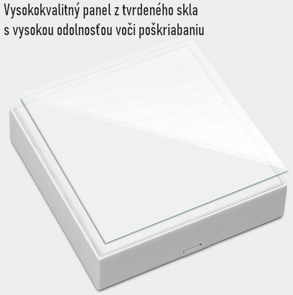 Magnetická montáž, povrchová inštalácia bez potreby ťahania kabeláže; predný panel z temperovaného skla.