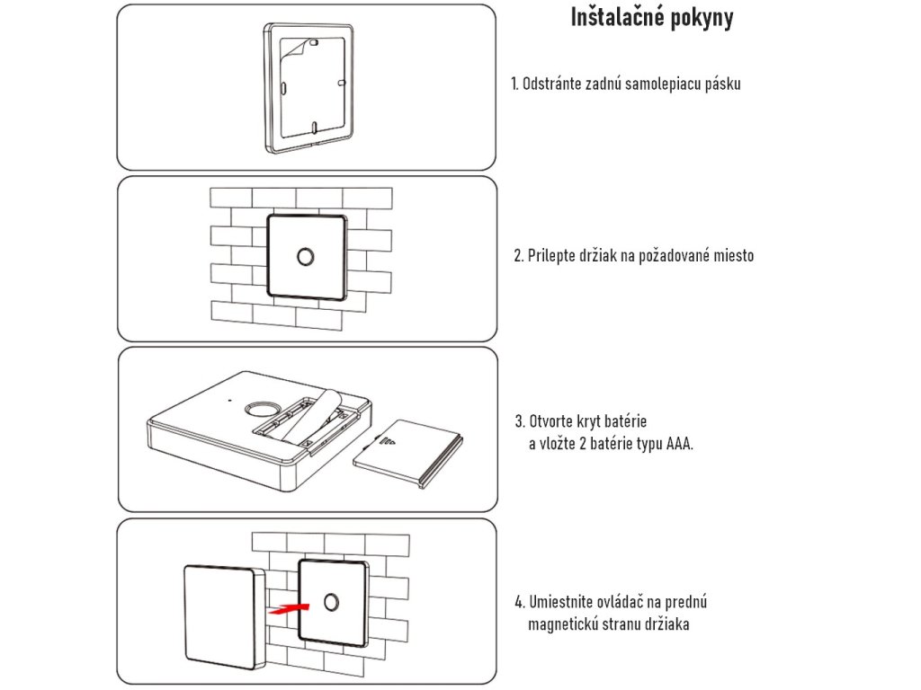 Pred montážou vlož 2× AAA batérie, otestuj reakciu tlačidiel a dosah v mieste plánovanej inštalácie.