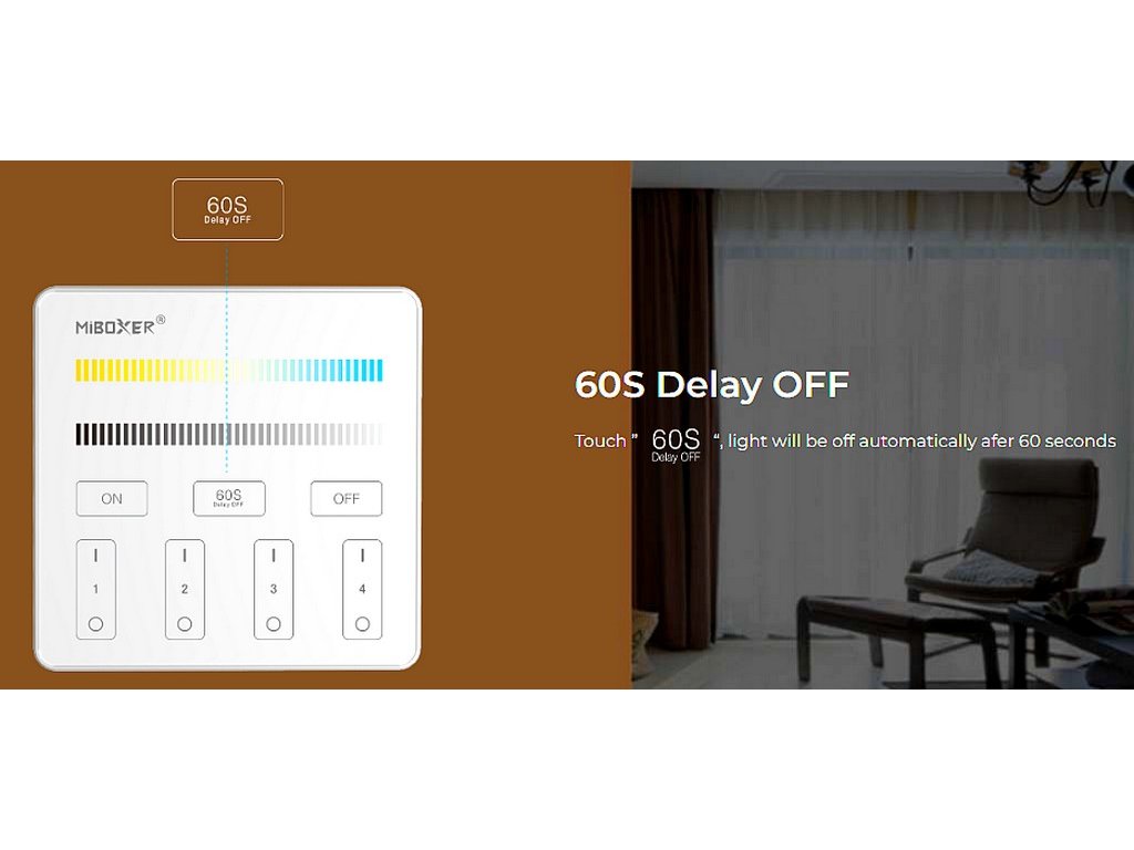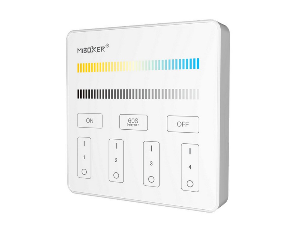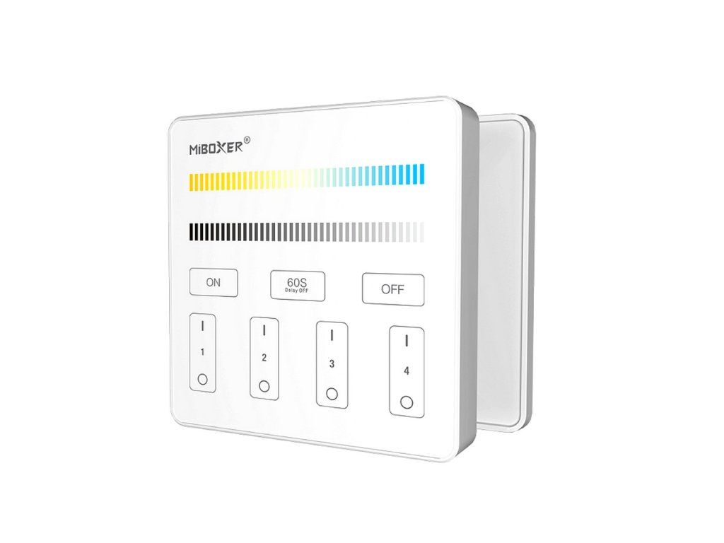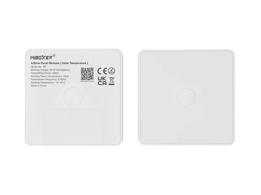 MiBoxer B2 je 4‑zónový panelový RF ovládač špeciálne navrhnutý pre CCT (dual‑white) LED osvetlenie – umožňuje plynule meniť jas a teplotu bielej (od teplej po studenú) v štyroch samostatných zónach, pričom každá zóna môže obsahovať ľubovoľný počet kompatibilných prijímačov alebo svietidiel v dosahu. Panel využíva kapacitné dotykové ovládanie, takže reakcia na dotyk je rýchla a presná, a farebný CCT slider v hornej časti uľahčuje intuitívne nastavenie odtieňa bielej.