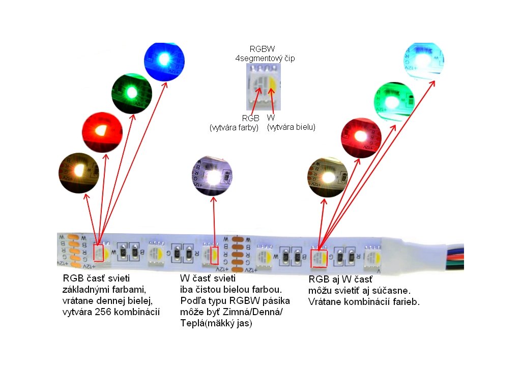 LED RGBW pásik osadený je 4 segmentovými čipmi pre samostatné vytváranie RGB aj bielej farby svetla v každom čipe. Dosiahla sa tým vysoká intenzita bielej farby, jej lepšie podanie ako pri klasickom RGB pásiku, lepšie možnosti nastavovania farieb, rovnomerná farebná škála a súvisle svetlo pri nastacvení ktorejkoľvek farby alebo rovnako aj pri bielej farbe.