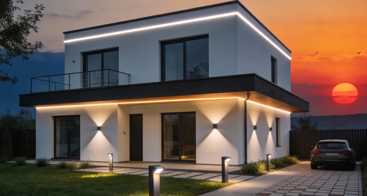 Automatické spínanie záhradných LED reflektorov, LED pásikov na fasáde, chodníkového či príjazdového osvetlenia okolo domu.