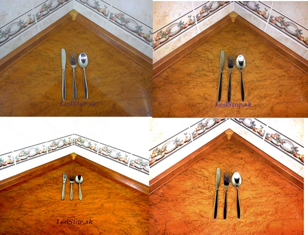 Na nasledujúcich záberoch uvidíte ako vyzerá príbor pri svetle jednotlivých modelov LED pásika. Pri porovnaní sme sa nezameriavali na svetlo, ktoré vytvára pásik v priestore kuchyne. Účelom bolo porovnať intenzitu svetla ktoré dopadá na pracovnú dosku. Najčastejšou obavou zákazníkov je práve skutočnosť či svetlo pásika bude postačujúce na vykonávanie bežných úkonov na kuchynskej linke.