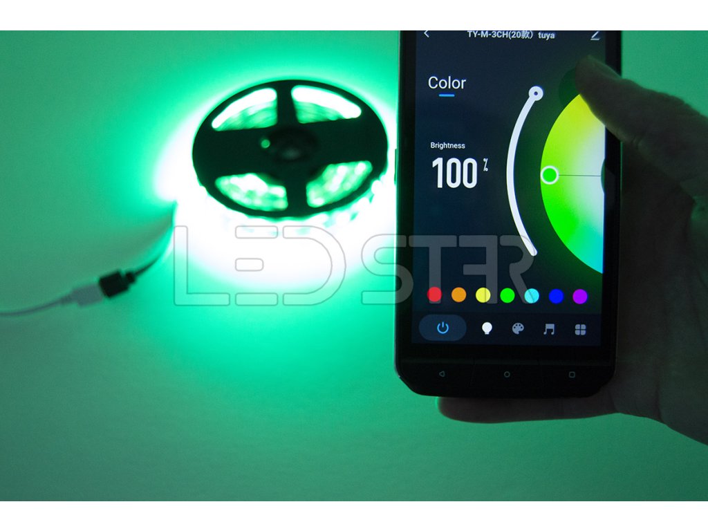 Tuya WiFi Led RGB ovládač pre ovládanie mobilom, alebo vlastným diaľkovým ovládačom. Na stlačenie tlačidla prepnete na režim "Music"  - farebná hudba". Ovládač podporuje všetky RGB pásiky, tj na 5V,12V aj 24V.